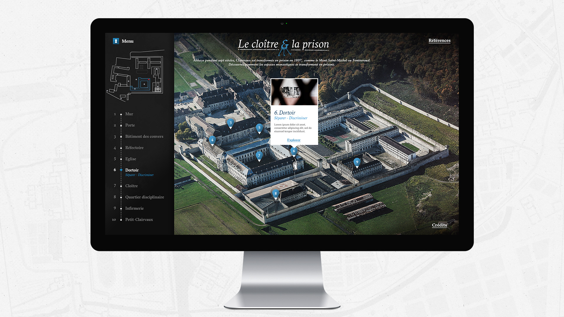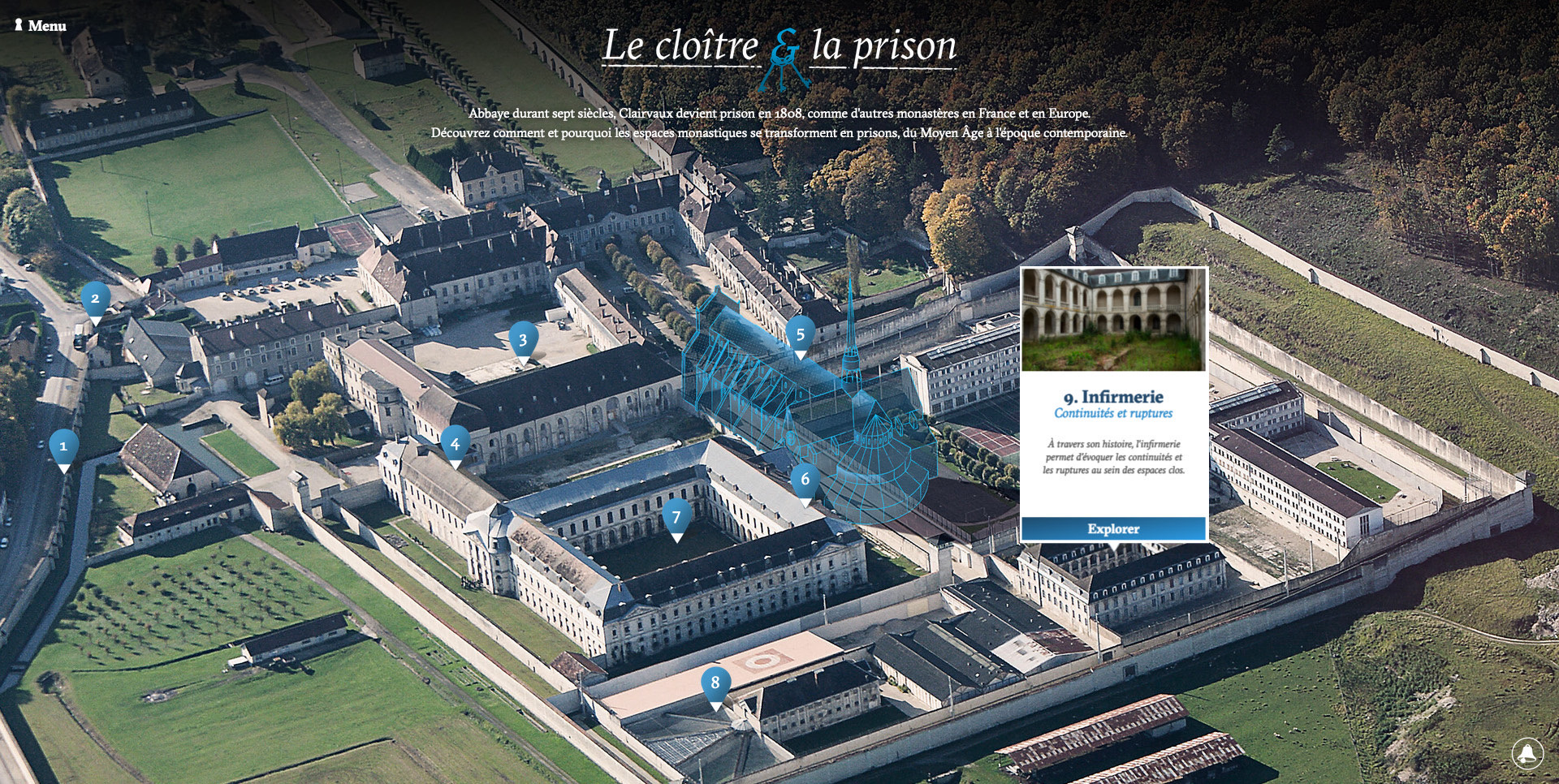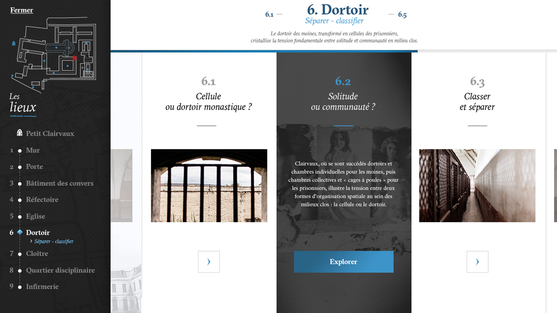 In collaboration with Lumento for the video/photography content and Alexandre Croizard with development, we organized this huge content into an interactive journey through Clairvaux Cloister to discover all the aspects of both prison and monastic life.
