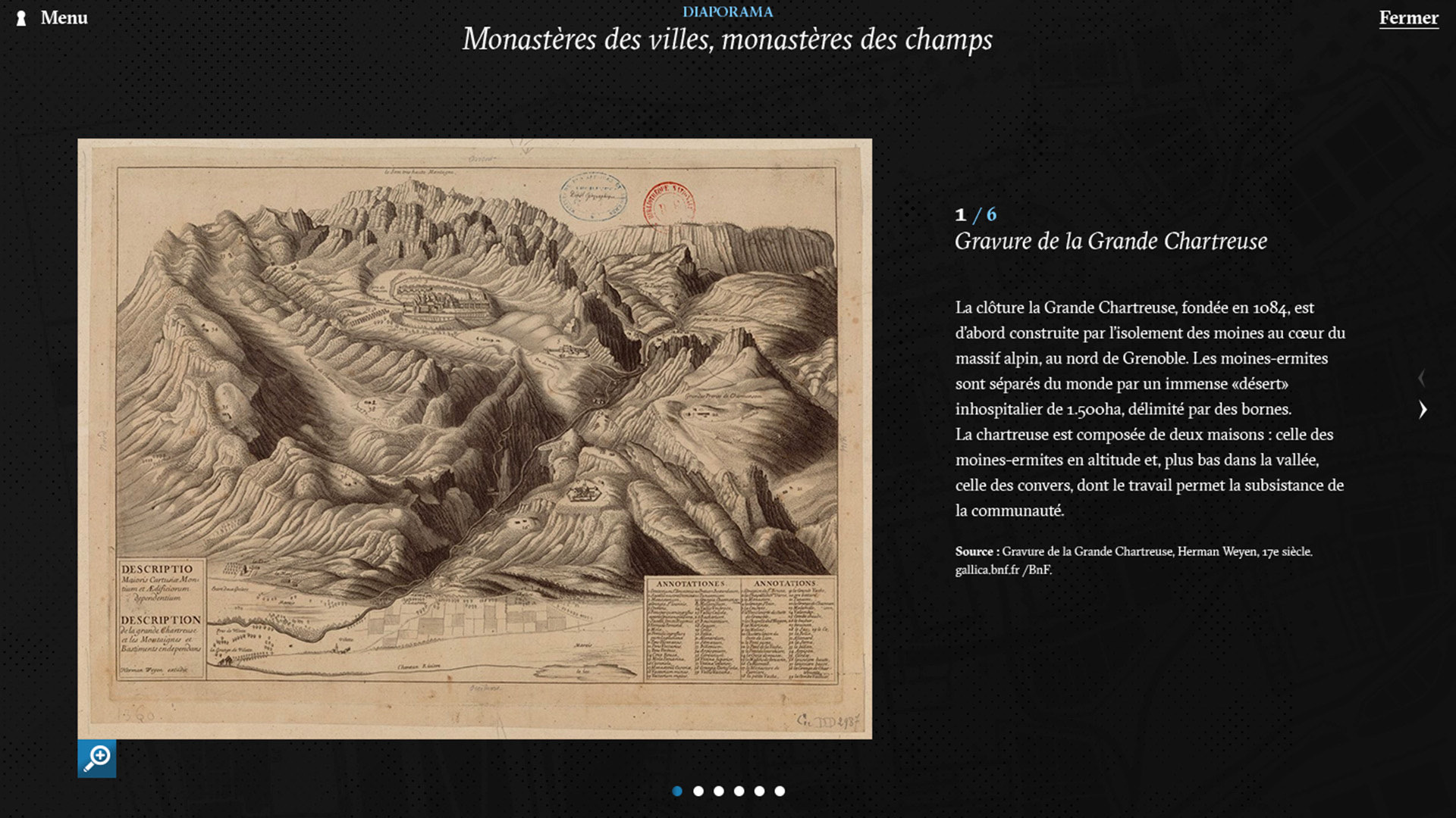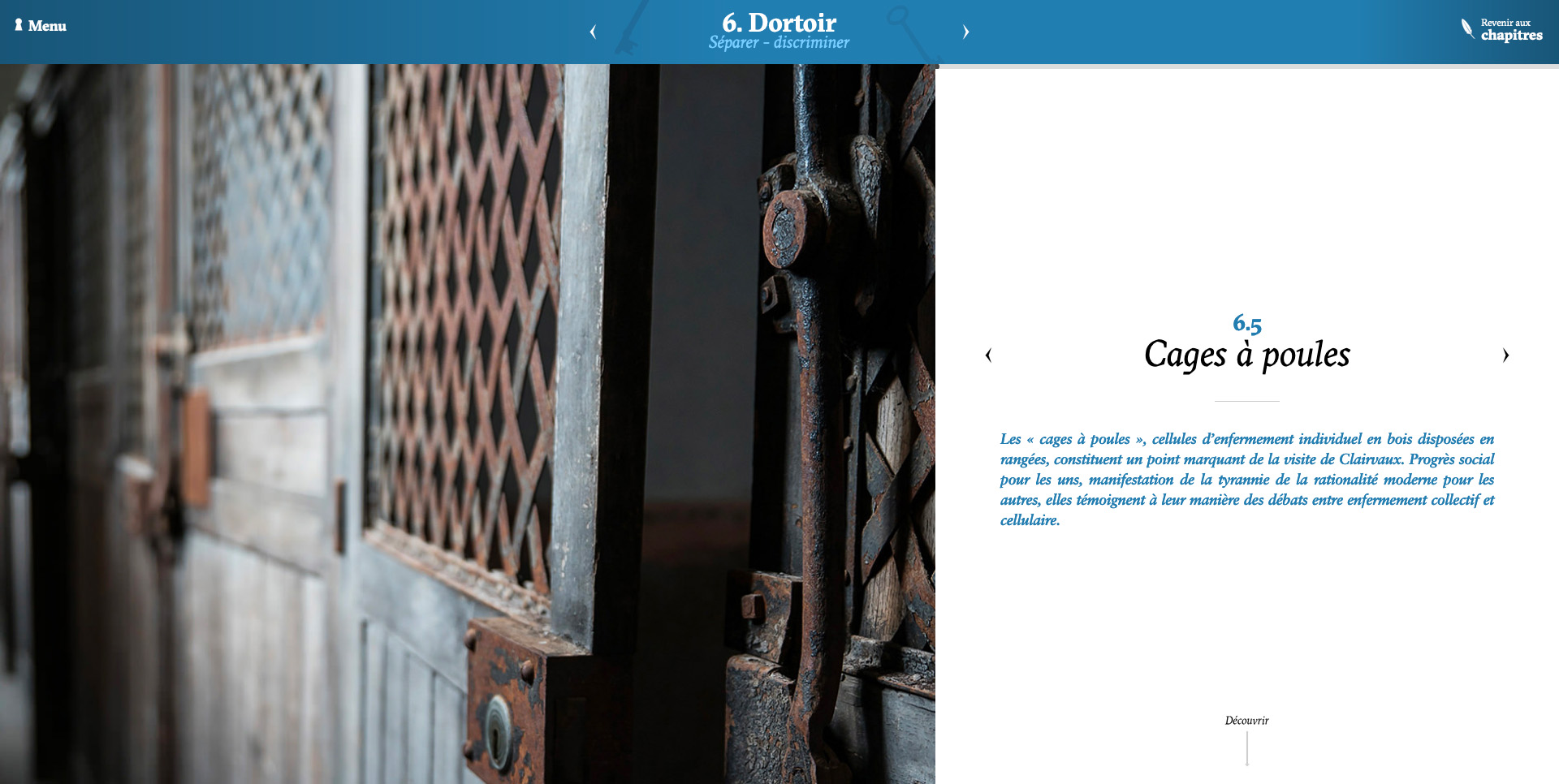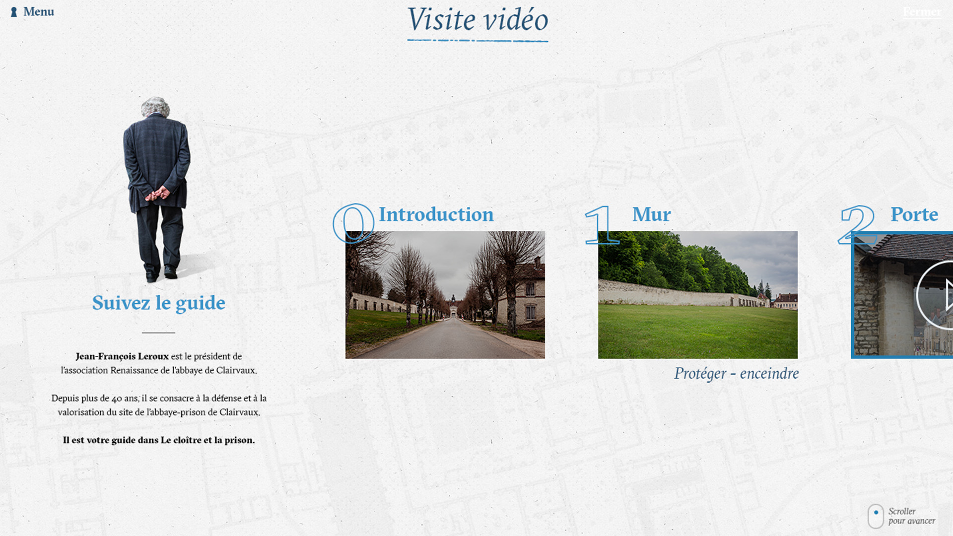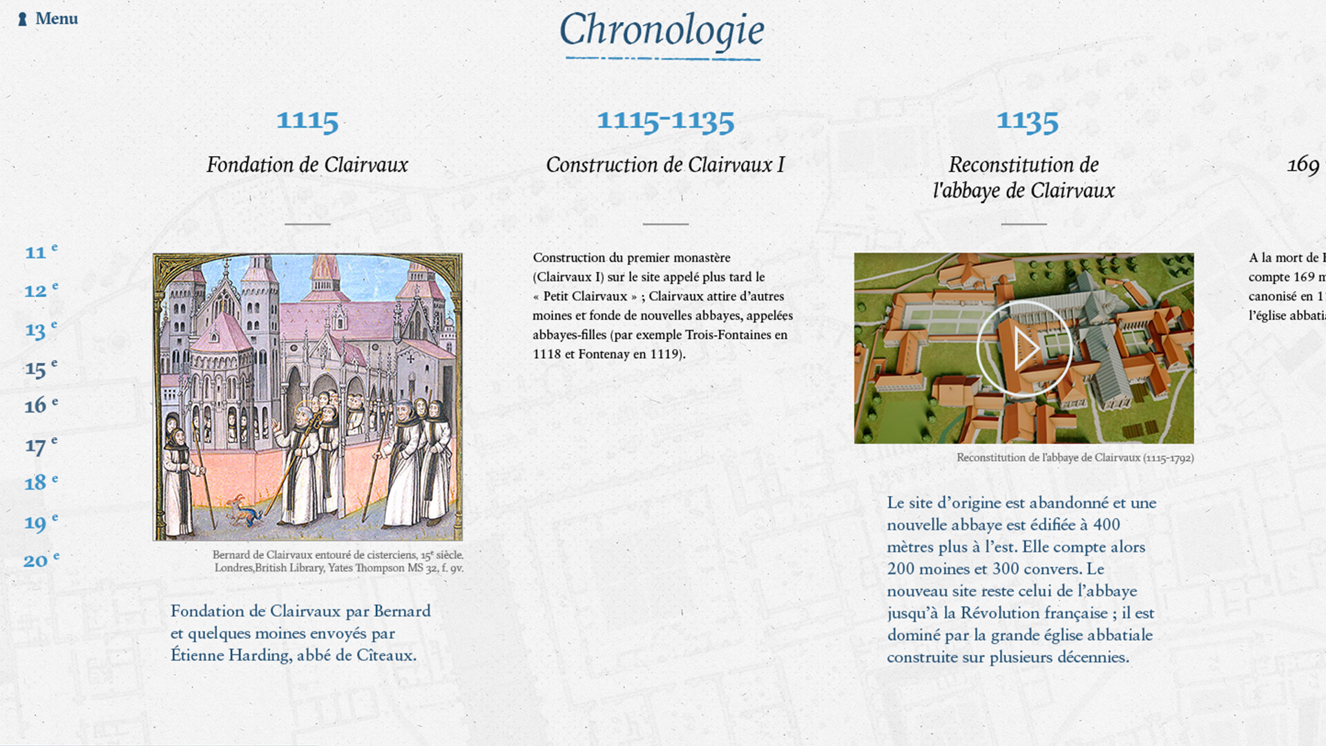 In collaboration with Lumento for the video/photography content and Alexandre Croizard with development, we organized this huge content into an interactive journey through Clairvaux Cloister to discover all the aspects of both prison and monastic life.