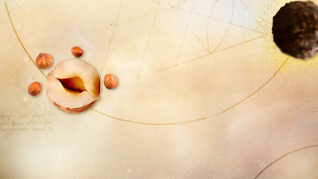 From the core of the ice cream (the rocher) is drawn a perfect circle atound the other ingredients to create the Ferrero Rocher Ice Creams in the style of the genius-y / alchemist-y Da Vinci.